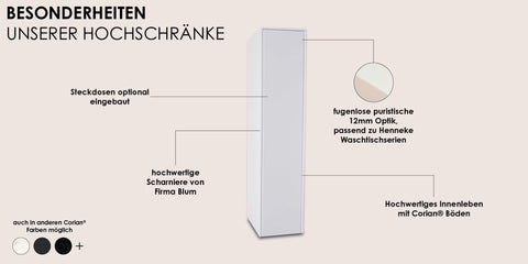 Die Hochschränke by Henneke sind die perfekte Ergänzung für Ihre Badgestaltung. Mit einer klaren, geradlinigen Formensprache – puristisch, funktional und kompromisslos hochwertig. Komplett aus original DuPont™ Corian® gefertigt, überzeugen die Hochschränke durch ihre nahtlose Verarbeitung, pflegeleichte Oberfläche und langlebige Qualität – ideal für den Einsatz im privaten Bad wie auch in Hotels, Spas oder anderen Objektbereichen - Made in Germany, im Sauerland.