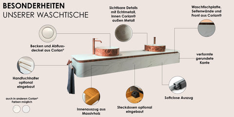 - Farben: Corian® Calacatta Greige mit Metall Kupfer Crush oder Corian® Glacier White mit Plex Gold
