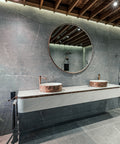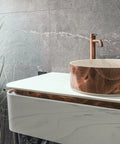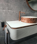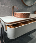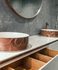 Diese Materialkombination verbindet funktionale Perfektion mit einer außergewöhnlichen visuellen Tiefe und macht den Waschtisch zu einem echten Blickfang.