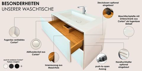 Gefertigt aus echtem DuPont™ Corian® in Glacier White, überzeugt jedes Modell durch eine klare Formensprache, hohe Qualität und langlebige Handwerksarbeit – Made in Germany, im Sauerland.